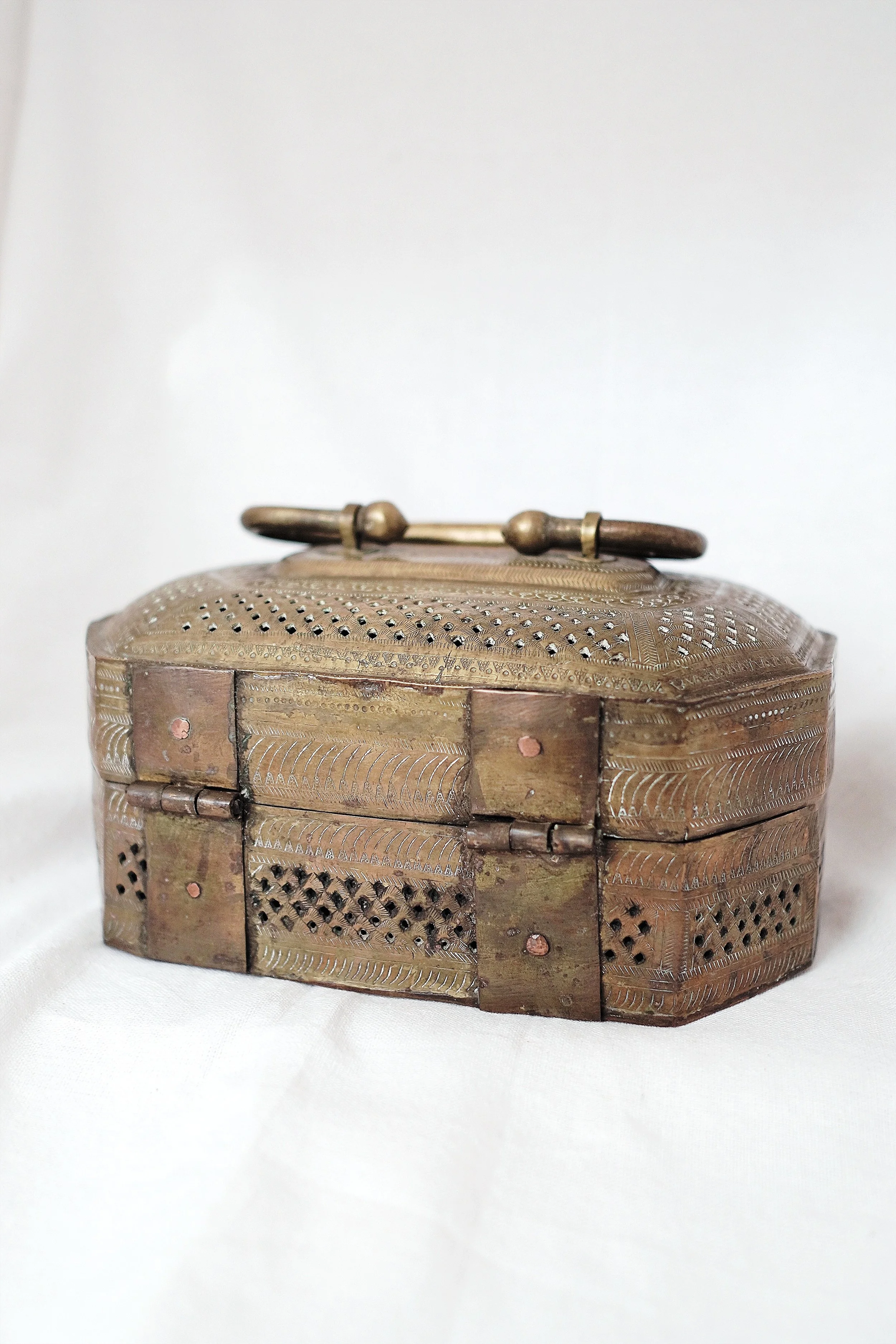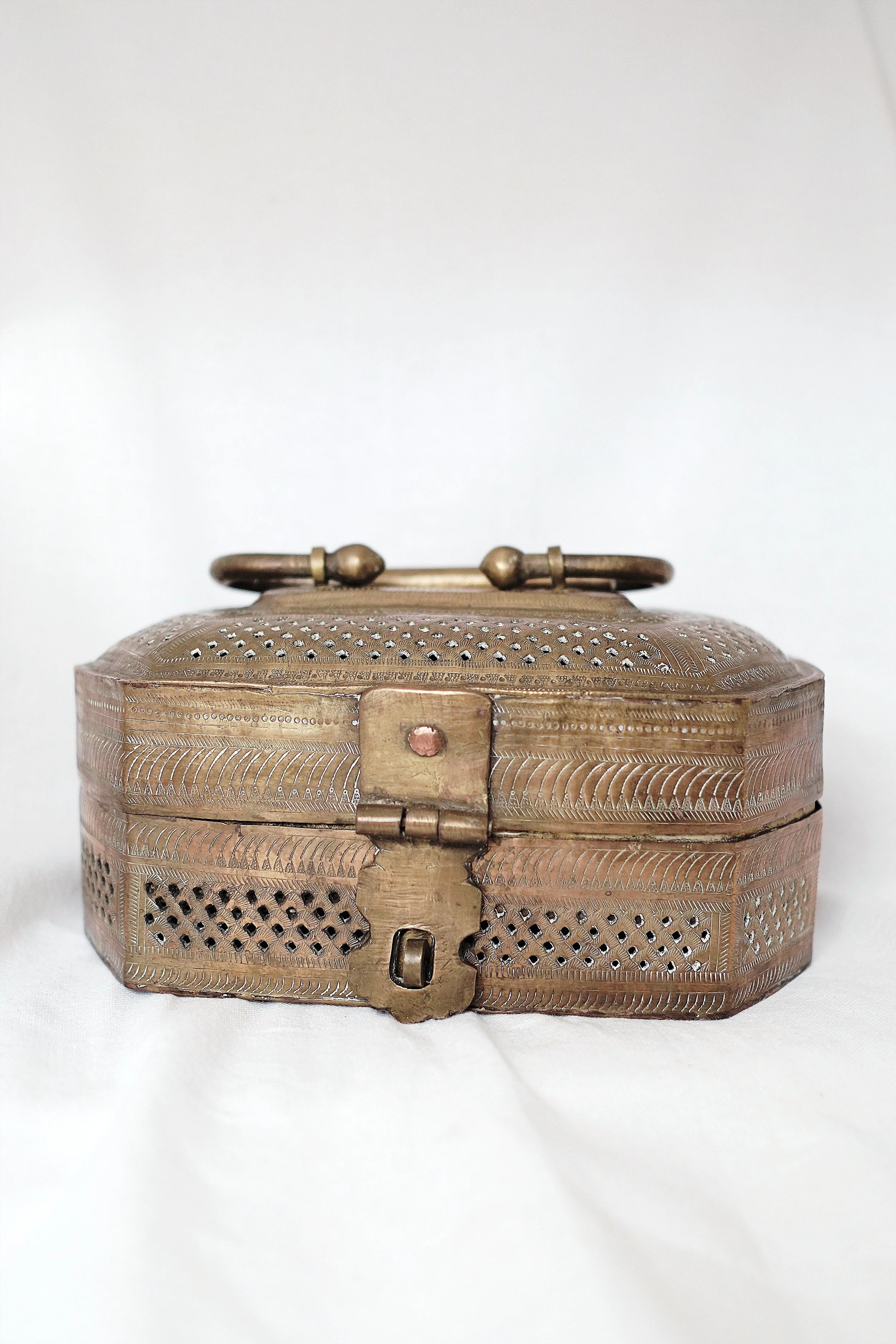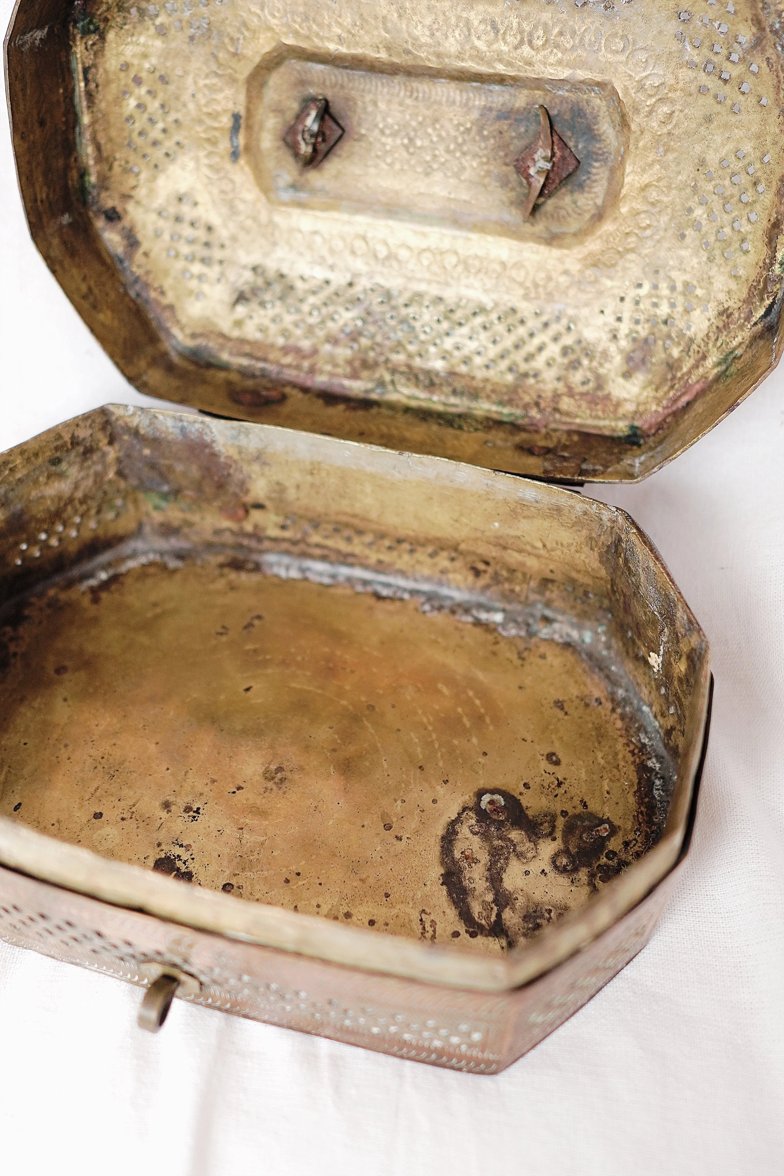 This antique piece is a true stunner! Expertly crafted with an intricate hand-carved design, it showcases timeless artistry and original hardware that add to its authenticity. The beautifully aged patina enhances its character, telling a rich story of the past. While the exterior has held up well, the interior has some surface rust—easily managed with a linen lining or organizing trays for preservation. A rare find with enduring charm, perfect for adding history and elegance to any space!